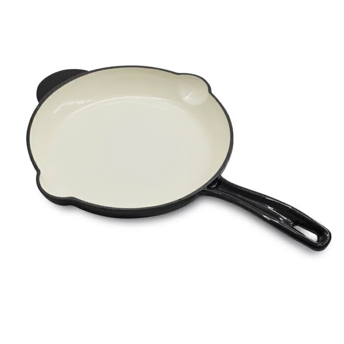 Sartén de hierro fundido antiadherente esmaltado. Gracias a su sistema de recirculación, el vapor se condensa rápidamente en gotas que caen sobre la preparación para resaltar sabores, recuperar los nutrientes y obtener resultados más jugosos y vistosos. Este producto soporta muy altas temperaturas. Por su mango de hierro, todas las preparaciones pueden terminarse dentro del horno. Ideal para sellar carnes y finalizar su cocción en el horno.